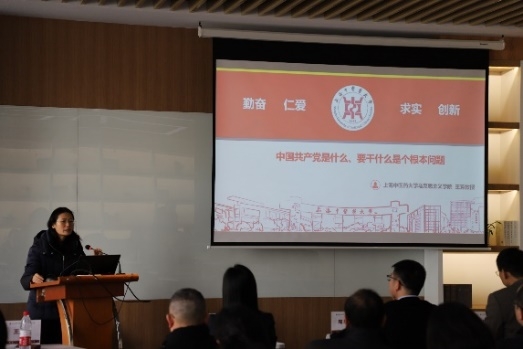 马克思主义学院院长王芳分享学习十九届六中全会精神和《中共中央关于党的百年奋斗重大成就和历史经验的决议》的体会,并作题为《中国共产党是什么、要干什么是个根本问题》的报告。报告从“这一根本问题的具体内涵”“这一根本问题的重大意义”“是个根本问题也是个难题”三个方面作深入剖析。