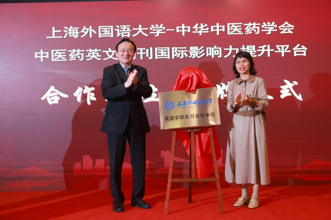 平台主席徐建光和上海外国语大学英语学院党委书记杨雪莲,共同为中华中医药学会中医药英文期刊国际影响力提升平台与上海外国语大学国际出版人才培育项目“学生实习合作单位”揭牌。