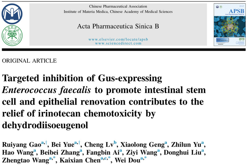 近日,beat365中药研究所陈凯先院士、王峥涛教授和窦薇研究员团队在ActaPharmaceuticaSinicaB发表题为TargetedinhibitionofGus-expressingEnterococcusfaecalistopromoteintestinalstemcellandepithelialrenovationcontributestothereliefofirinotecanchemotoxicitybydehydrodiisoeugenol的研究论文,揭示了中药肉豆蔻活性成分去氢二异丁香酚在缓解伊利替康化疗肠毒性中的积极疗效,提出“Gus表达细菌-宿主-伊立替康轴”作为减轻化疗消化道副反应的药物研发新策略。伊立替康(Irinotecan,CPT11)是一种天然生物碱——喜树碱的半合成类似物,广泛用于治疗多种恶性肿瘤,包括结肠癌、胃癌、胰腺癌、卵巢癌等。然而,CPT11的临床应用受到延迟性腹泻的限制。大量研究已经阐明了CPT11诱导腹泻的机制,强调了其代谢产物7-乙基-10-羟基喜树碱(SN38)的肠肝再循环和细菌β-葡萄糖醛酸酶(Gus)的参与。现有针对CPT11肠毒性