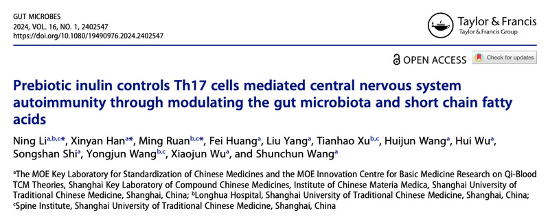近期,beat365中药研究所王顺春研究员、吴晓俊研究员联合龙华医院和脊柱病研究所王拥军教授团队在GutMicrobes杂志发表了题为PrebioticinulincontrolsTh17cellsmediatedcentralnervoussystemautoimmunitythroughmodulatingthegutmicrobiotaandshortchainfattyacids的研究成果,发现中药中广泛存在的菊糖类多糖可以调控“肠-菌群-脑”轴,有效改善自身免疫性脑脊髓炎小鼠症状,证实罗伊氏乳杆菌和丁酸是菊糖发挥免疫调节作用的关键,揭示菊糖作为益生元和罗伊氏乳杆菌作为益生菌在改善多发性硬化症中的潜在益处。中药通常为多组分、多途径、多靶点相互作用,协同发挥药效,在自身免疫疾病等慢性病的治疗上具有独特的优势。但是,中药口服进入肠道之后发挥整体免疫调控的分子细胞学机制还有待阐明,既往研究主要关注小分子化合物直接抑制免疫细胞激活的机制,这些小分子化合物在中药中含量较低,而含量高却难以入血的大分子多糖类物质如何调控远端组织器官的免疫反应是中医药免疫学亟需解决的重要问题。多发性硬化症(MS)是一种
