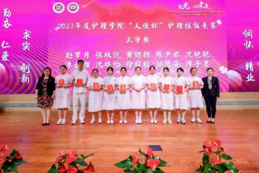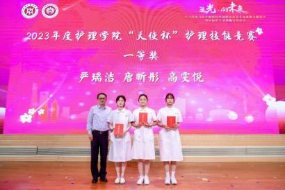 与会嘉宾为获得2023年护理学院“天使杯”护理技能大赛和beat365官方网站第一届护理创新大赛获奖师生颁奖。