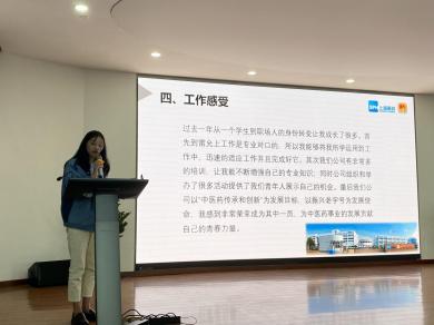 中药学院2016级中药学毕业生高守甲、2017级中药学毕业生王雨婷、2018级中药学毕业生黄邦路在“学长学姐说”环节向与会人员分享了入职上海雷允上药业有限公司后的个人成长与发展,并对学校及公司的培养表示感谢,表示未来将秉持初心继续在岗位上用心做好各项工作。六神丸非遗技艺第七代传承人王圣洁为中药创新班师生进行现场手工泛丸展示。