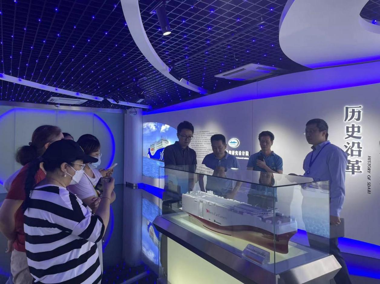 师生们在上海船舶研究设计院黄尊礼的带领下,参观了智能船舶创新实验室、上海船舶研究设计院院史展厅。上海船舶研究设计院是中国船舶集团有限公司旗下具有国际影响力的船舶总体设计单位,服务范围涵盖船舶研发设计、船舶绿色节能、智能产品业务和船舶全生命周期保障业务。在智能船舶创新实验室,通过AI技术,师生们身临其境地感受到了现代船舶的航行体验。在院史展厅,师生们了解了上海船舶研究设计院及我国船舶设计建造发展历史。师生们被设计院致力于提升我国智能船舶产业技术核心竞争力,助力船舶工业转型升级及数字化航运的发展所作出的贡献深深感动,也为我国自行设计的大型船舶服务于全球发展而倍感自豪。