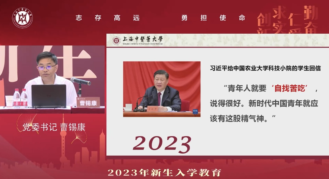 曹锡康还引用发生在大学生身边的真实案例,勉励同学们要成为一名守正创新的学者、一名大医精诚的医者、一名慈爱奉献的仁者。最后,他结合习近平总书记对新时代大学生群体的殷切期望,强调大学生“自找苦吃”,就要以理想照亮前行的路,以担当彰显初心使命,以吃苦锤炼过硬本领,以奋斗感应时代脉搏,坚持为人民服务,为改革开放和社会主义现代化建设服务。希望新时代的中医青年能接过接力棒,在上中医放飞梦想、激扬青春,继续书写无愧于时代的壮丽篇章。