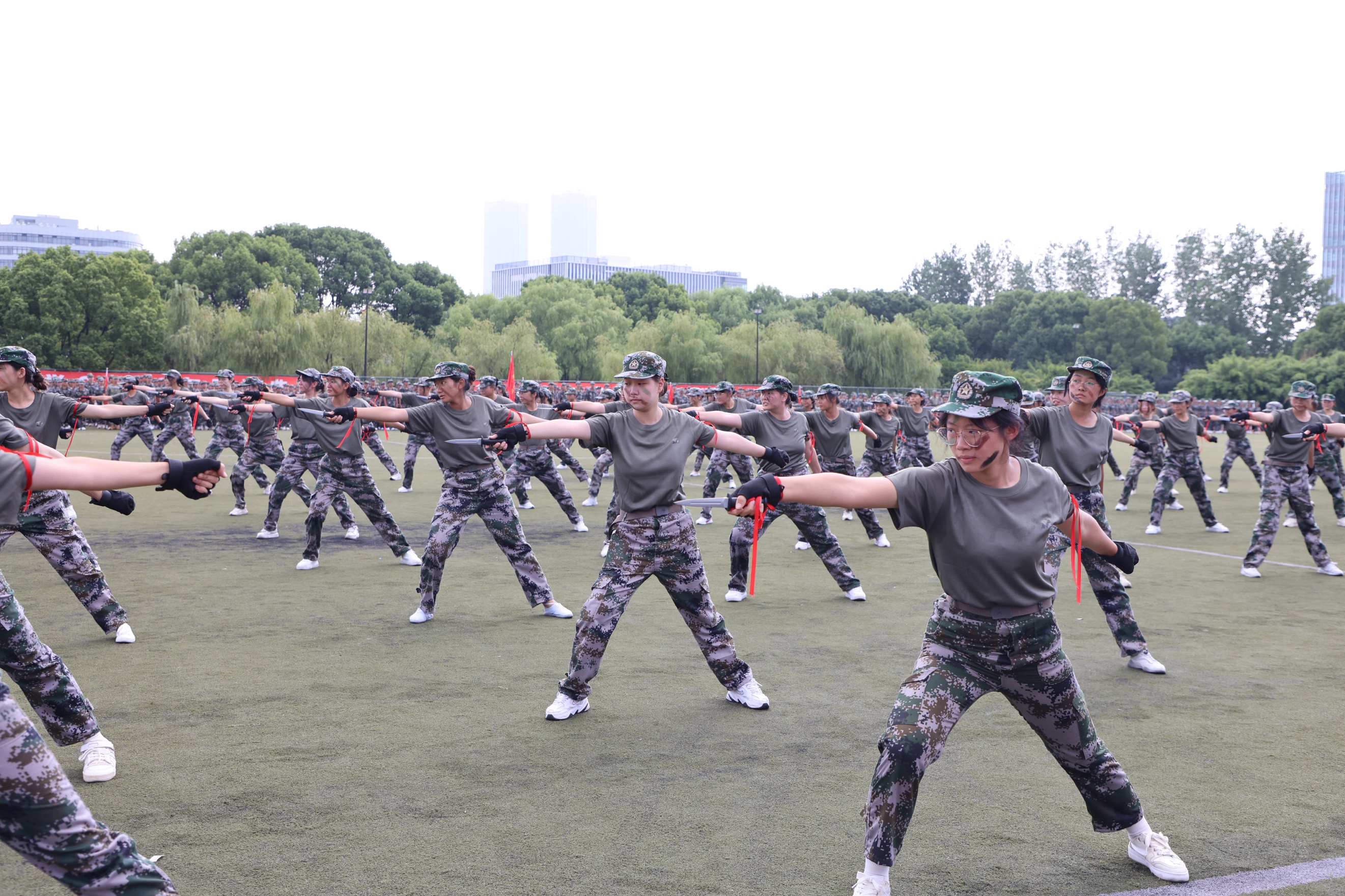 总结大会在雄壮的中国人民解放军军歌声中拉开序幕,校领导检阅军训队伍,捕俘拳和捕俘刀表演方阵将军事汇报推向高潮,各连排依次迈着坚定的步伐走过主席台,军训学员口号响亮,精神抖擞,充分展现了上中医学子奋发向上的精神面貌。