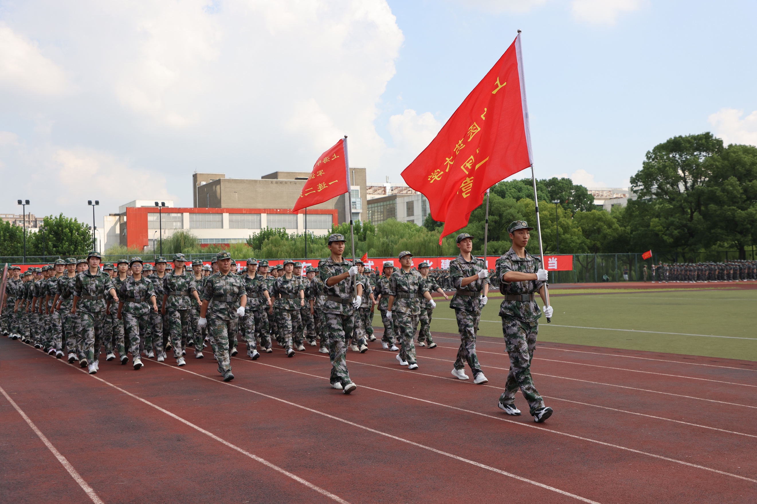 鲍俊成代表部队讲话,他看到同学们在军训这个大熔炉里淬炼成钢,勉励大家自强自立、追逐梦想,继续书写绚烂无悔的青春篇章,在中国式现代化建设中挺膺担当。