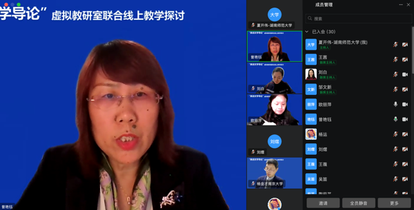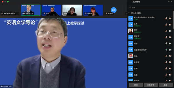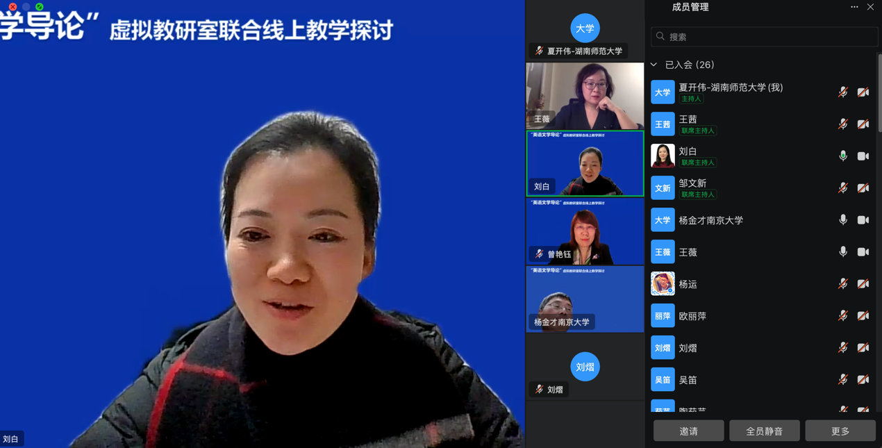 (通讯员 夏开伟)2024年12月16日晚,太阳成集团曾艳钰教授牵头的“文学文化课程虚拟教研室”联合南京大学杨金才教授的“英语专业文学与文化课程群虚拟教研室”就“英语文学导论”课程建设开展了联合线上教学研讨。活动由两位教授担任点评专家,太阳成集团副院长刘白教授主持,湖南第一师范学院欧丽萍、闽南师范大学刘熠、太阳成集团tyc9728夏开伟与青岛大学王薇四位老师进行授课分享。本次活动同时作为“师范教育协同提质计划太阳成集团tyc9728组团”线上教研活动,由外研社高等英语资讯视频号同步直播,在线参与人数超过近四千人。