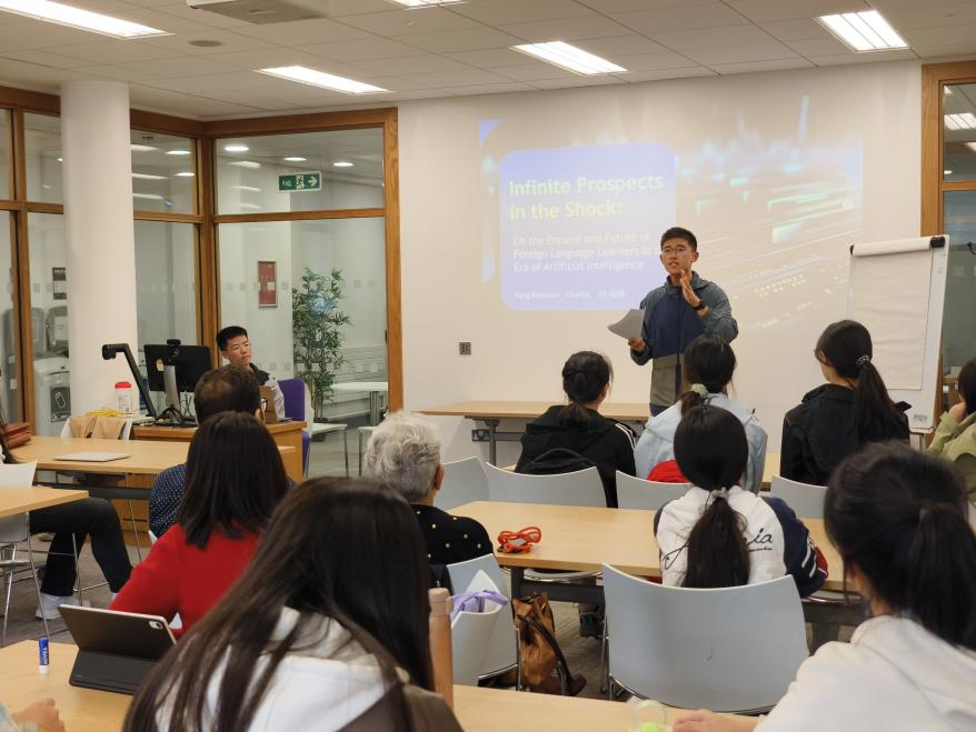 方浩轩同学则探讨了人工智能时代外语学习的机遇与挑战。他谈到,随着ChatGPT等技术的快速发展,外语学习模式发生变革,传统教学方式被多元化、个性化的学习形式取代。尽管AI在知识输入和翻译效率上超越人类,但情感、创造力等主观能动性仍是人类优势。未来外语学习需结合跨学科发展,发挥人类独特价值,实现人机协作下的高效学习。