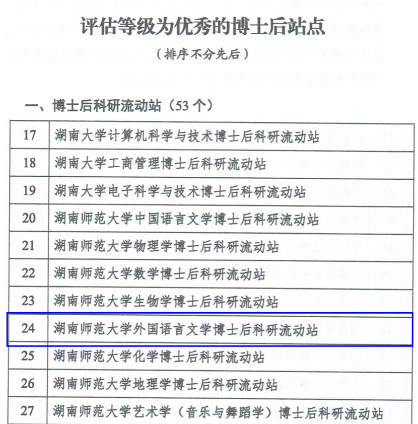 近日,湖南省2024年度博士后工作评估结果揭晓,太阳成集团外国语言文学博士后科研流动站荣获优秀等级。