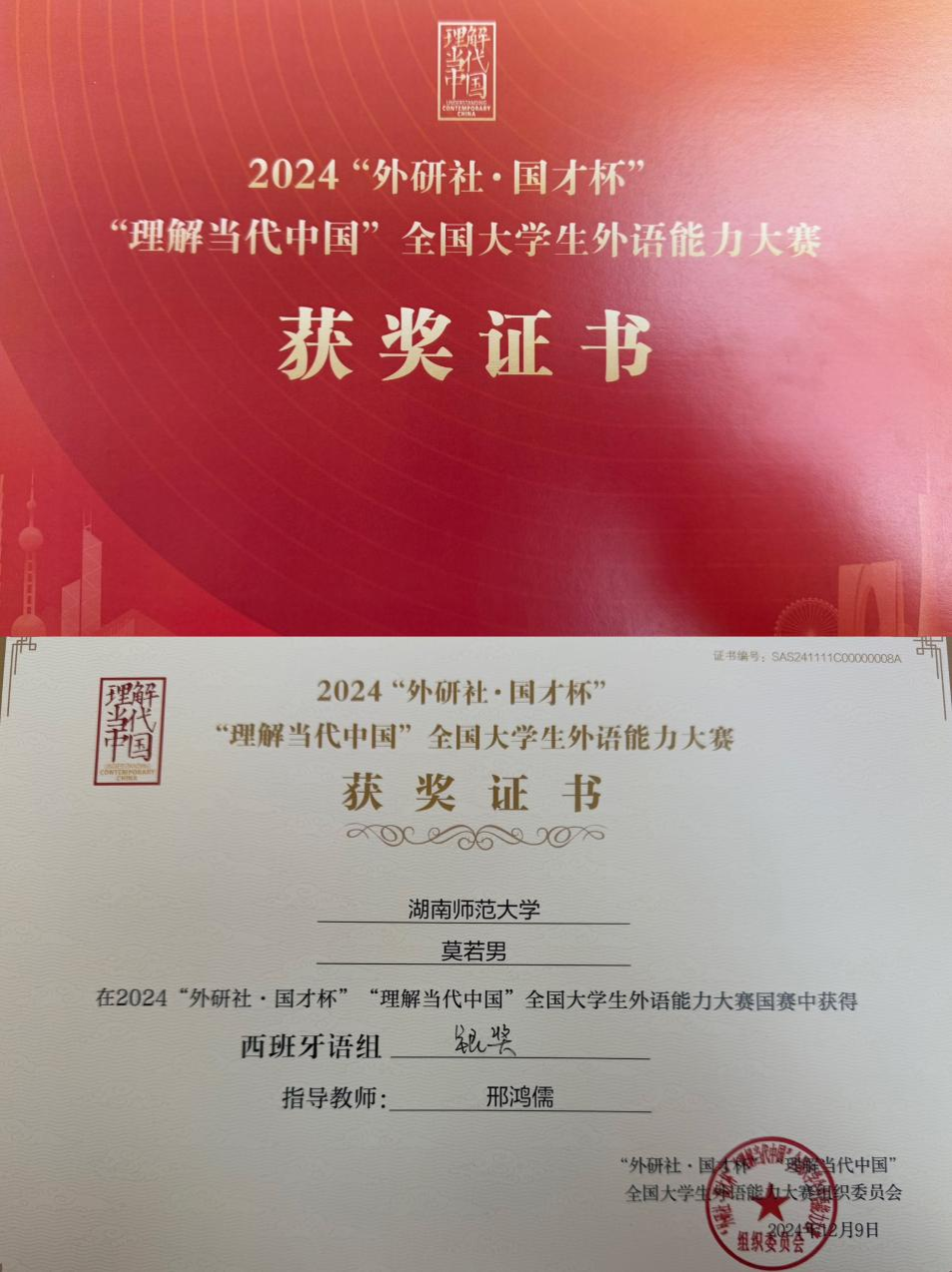 近年来太阳成集团tyc9728西班牙语专业积极组织学生参加高水平学科竞赛,以赛促学,以赛促教,且取得了许多优异的成果。莫若男同学此次获奖彰显出本专业对培养学生综合素质和提高人文素养的重视,在夯实学生语言能力的基础上,加强培育学生的责任意识和家国情怀。未来,西班牙语专业将继续着眼于国家战略需求培养高素质人才,秉持国际化人才培养理念,不断探索国际传播人才培养方式,培养和激励学生学好外语本领、讲好中国故事。