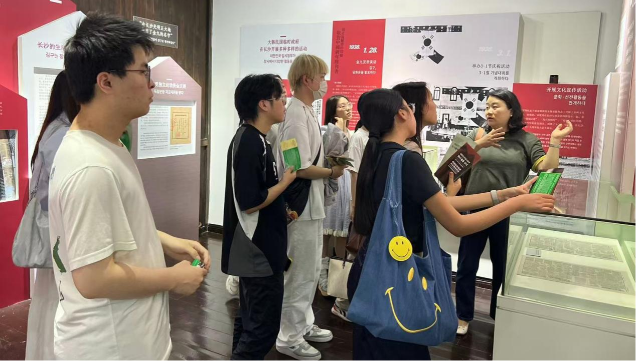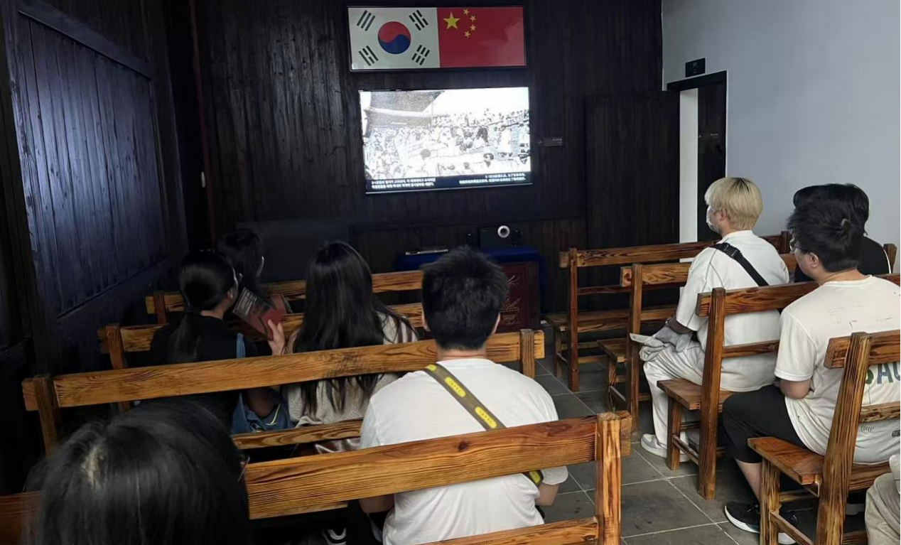 活动中,韩燕老师与同学们一同参观旧址内的各类展品。每到一处展示区域,韩燕老师都会结合展示内容进行细致讲解,生动介绍了韩国历史上的重要人物及其事迹,以及中韩两国在历史长河中结下的深厚友谊。随后,大家共同观看了相关历史影片,其中展现了临时政府成员在长沙开展地下斗争、争取国际支持、与中共及中国各界人士合作的史实。通过影像资料,同学们进一步直观地感受那段波澜壮阔的历史,加深了对所学知识的理解。