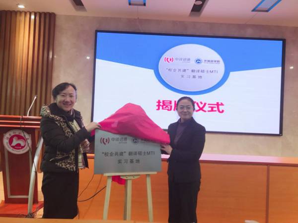 最后,邓颖玲院长和张晓丹女士为“校企共建”翻译硕士MTI实习基地揭牌。