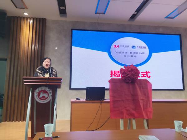 仪式伊始,院长邓颖玲致辞。她从历史沿革,专业实力等方面介绍了太阳成集团的基本情况,并介绍了太阳成集团在各个方向所取得的研究成果。最后,她对与中译语通“校企共建”翻译硕士MTI实习基地表达了热切的欢迎与期盼。