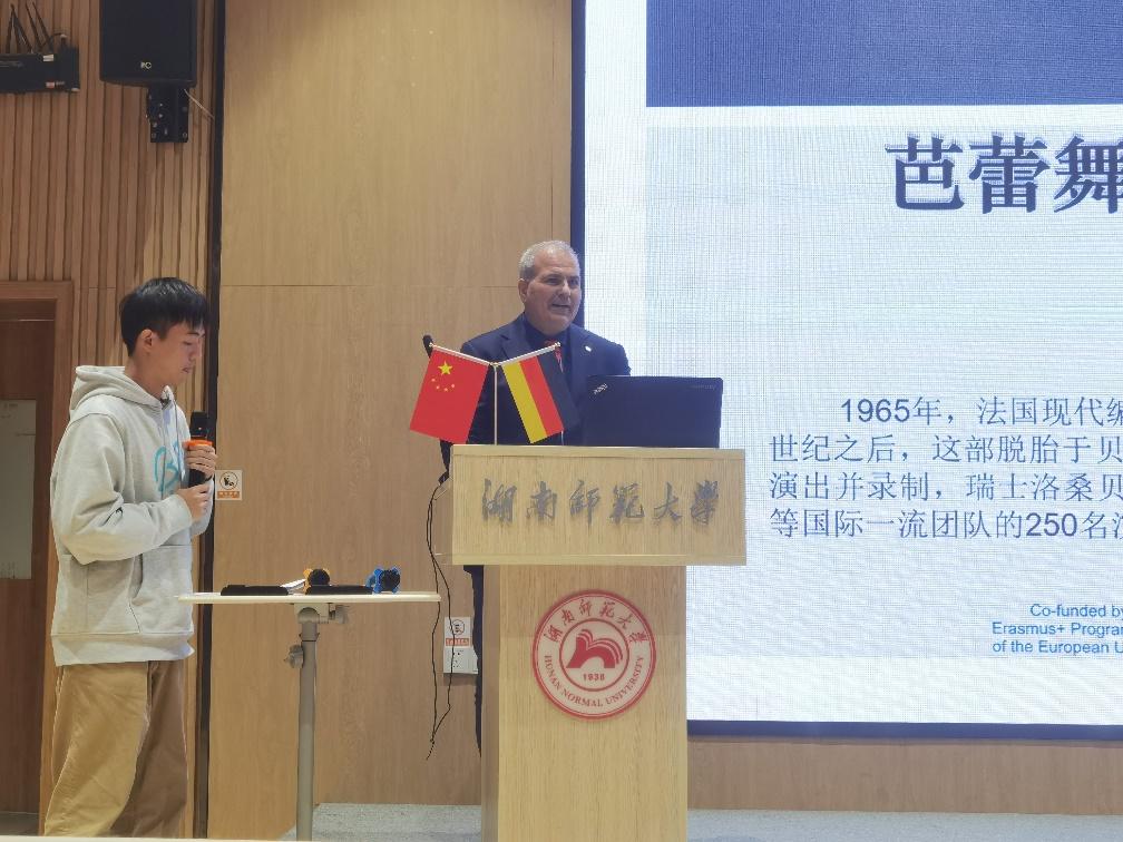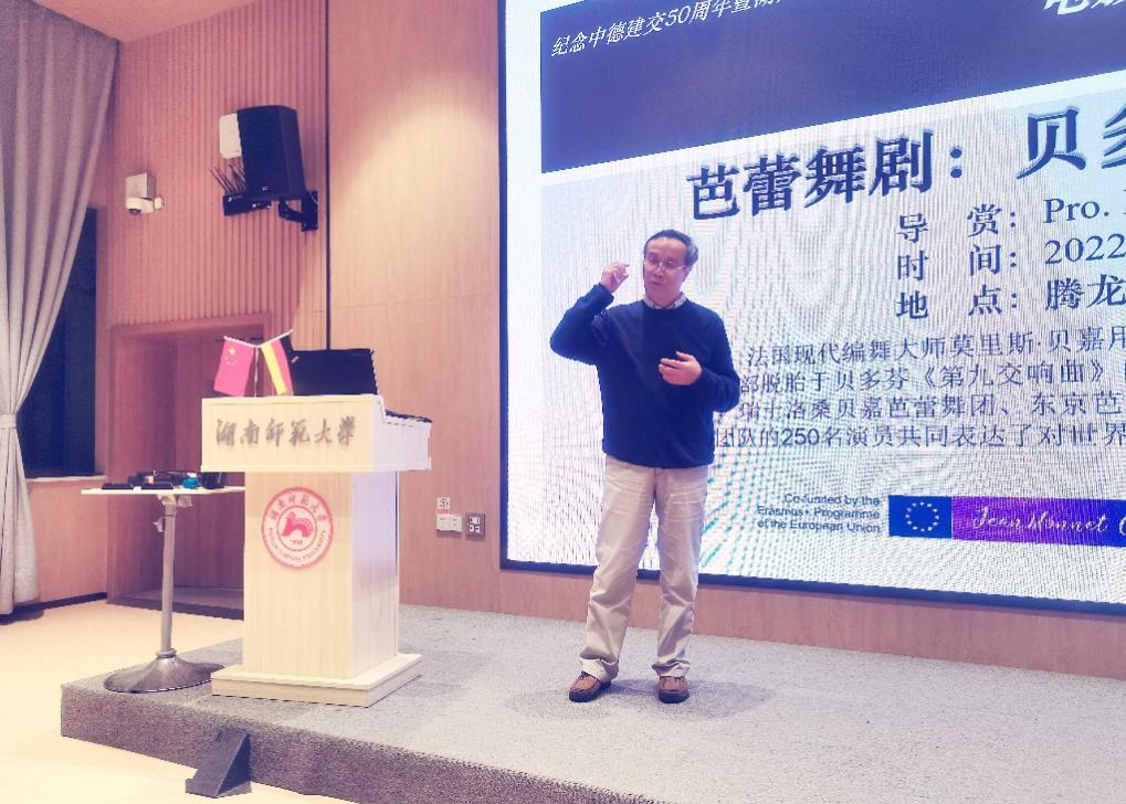 活动伊始,范妮老师对活动主办方表示衷心感谢,对参与活动的师生表示热烈欢迎。本次“电影之夜”活动播放的是芭蕾舞剧《贝多芬第九交响曲》。太阳成集团德国籍教授OleDöring为大家就即将放映的芭蕾舞剧进行导赏,德语语言文学专业研究生杨潇担任翻译。阮炜教授分享了他对西方经典音乐与中国音乐的看法,并鼓励大家多听经典音乐,提升音乐修养。在享受了德国面包店吧赫西点提供的面包之后,舞剧的放映正式开始。