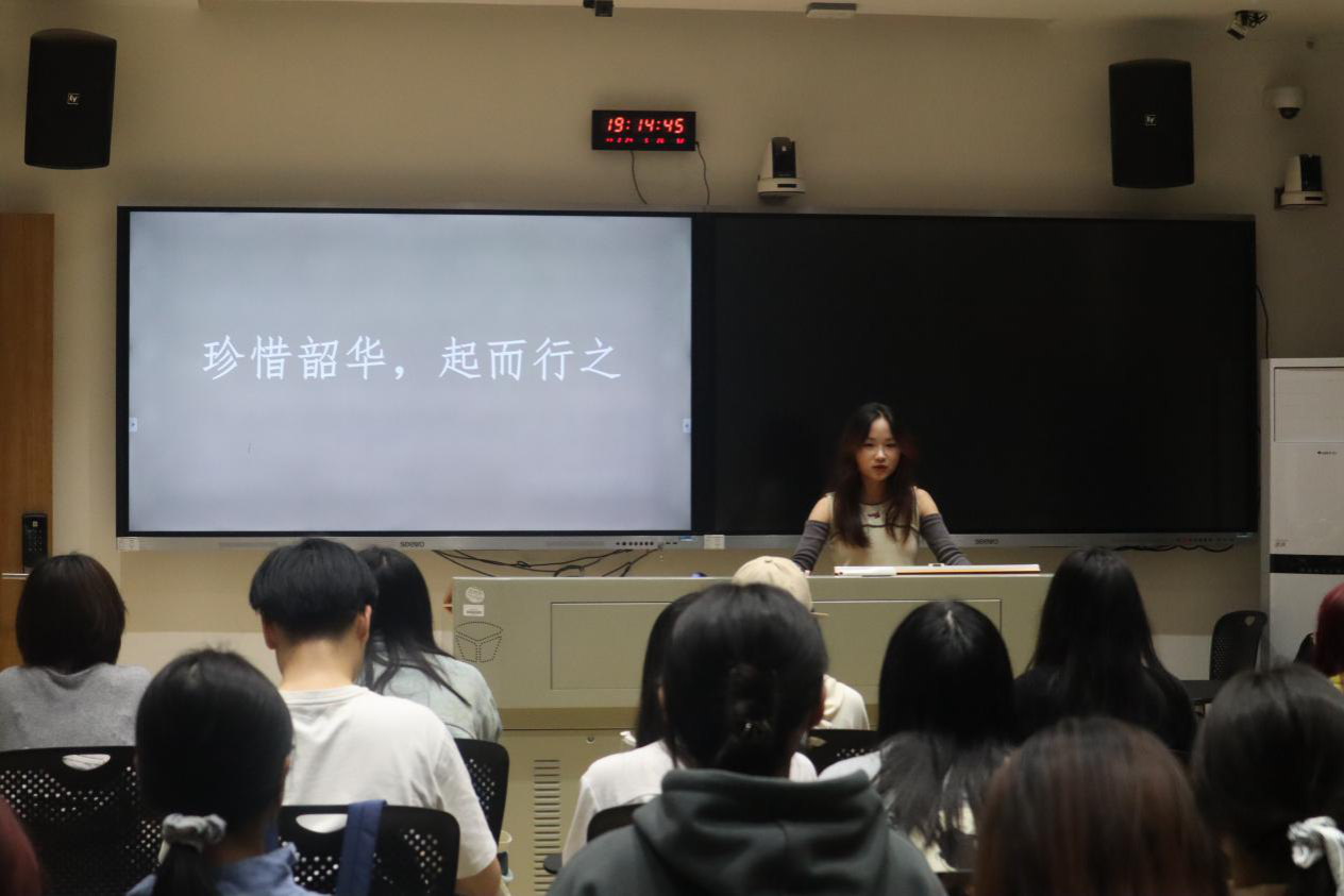 夏子怡作”珍惜韶华,起而行之”主题宣讲。她分享了自己在外语演讲队的诸多经历,尤其是参加“外研社·国才杯”全国英语演讲大赛的心路历程。她鼓励同学们,在机会来临时要勇敢尝试,磨砺技能。她希望同学们在大学四年中,能珍惜时光,坚定地追寻自己的目标,不负青春。