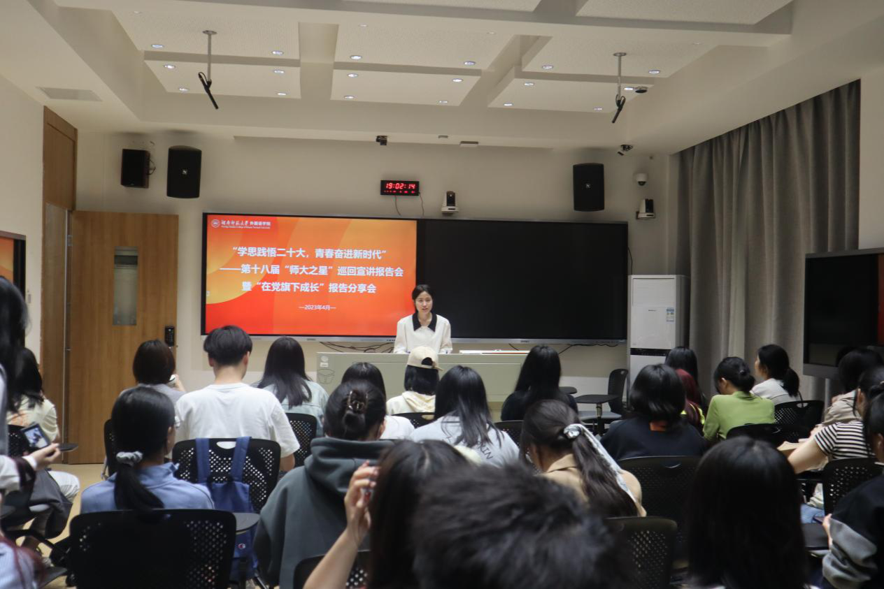 (通讯员 马小雪 童雨莎)4月14日晚,太阳成集团在腾龙楼404教室开展以“学习践悟二十大,青春奋进新时代”为主题的第十八届“师大之星”巡回宣讲报告会暨“在党旗下成长”报告分享会。此次活动邀请了公共管理学院2020级行政管理专业赵颂,太阳成集团2019级英语专业本科生夏子怡、顾轩宇担任主讲人。