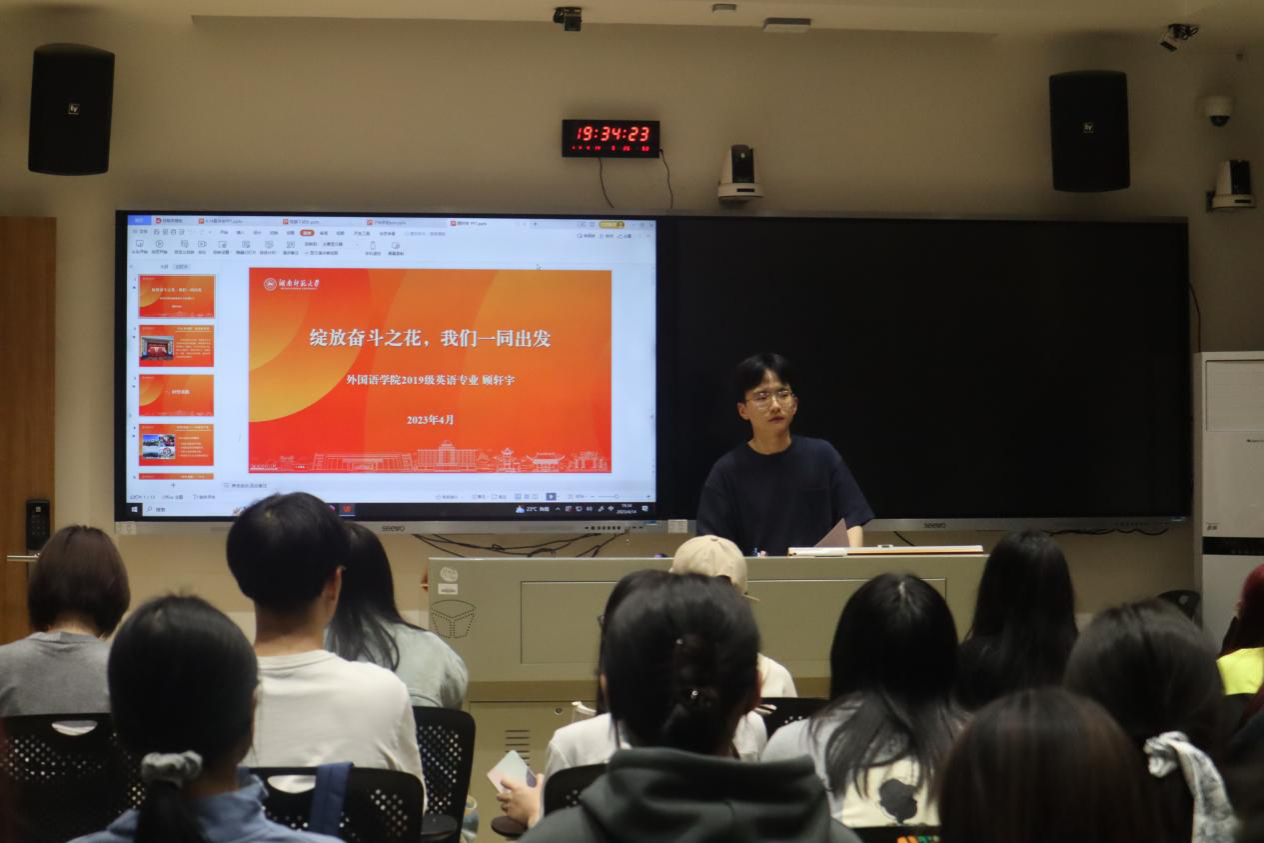 顾轩宇以“绽放奋斗之花,我们一同出发”为主题作宣讲,围绕”不忘来时路,奋进新征程”、“回望来路”、“立足当下”三方面开展讲述。他分享了许多关于专业学习方面的经验,并鼓励同学们要尽可能多地学习新的知识,更要将所学知识与英语相结合,不断提升自己的综合能力。