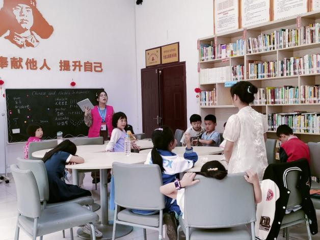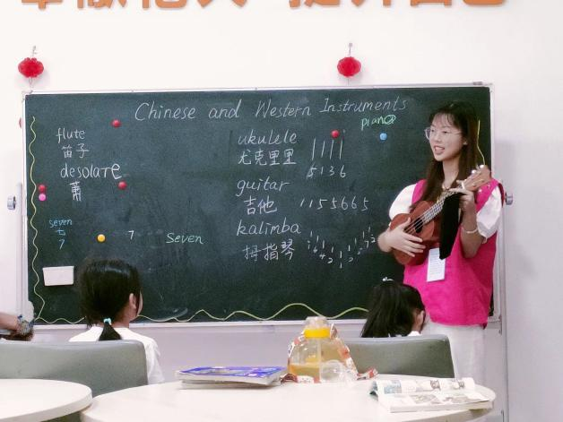 课堂之初,志愿者介绍了中国古典乐器——笛和箫,讲解了关于中国古典乐器的古诗词,带领小朋友们感受古典音乐的情境氛围。在此基础上,志愿者再依次介绍了古筝和古琴,让小朋友们对中国古典乐器有了更多样的了解。在介绍西方经典乐器的过程中,志愿者们将三角铁、尤克里里等乐器带入课堂,并为小朋友们进行了简单的演奏,同时在其中穿插教学音乐的相关英文表达,既增加了课堂的趣味性,也使教学更加充分和深入。