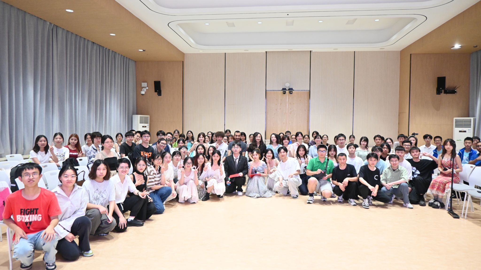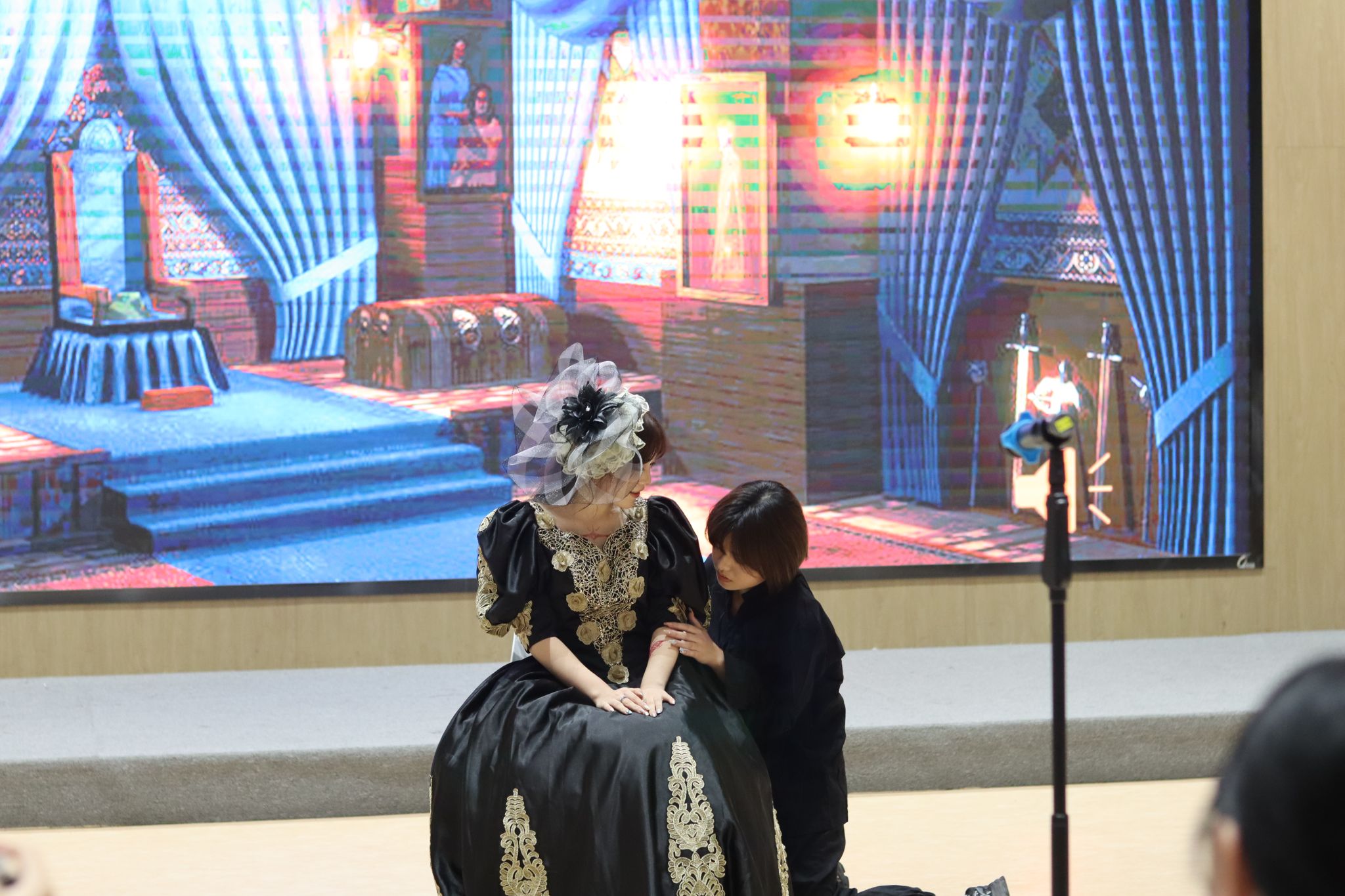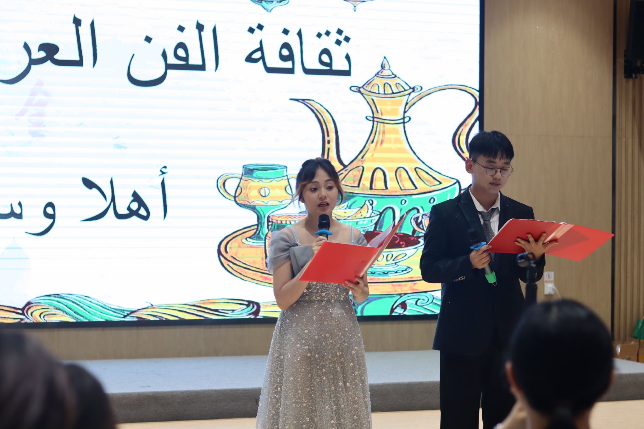 活动伊始,一首由阿拉伯语专业学生合唱的歌曲《كنفضوليا》悠扬响起,轻快的歌声和动人的旋律迅速点燃了全场气氛,观众纷纷加入互动,现场气氛热烈而激昂。随后,阿拉伯语专业学生带来了戏剧表演《山鲁佐德的秘密》,该作品改编自陶菲格·哈基姆的经典之作,在王定筠老师的指导下精彩呈现。随着剧情的推进,山鲁佐德的秘密逐渐揭晓,展现了自我意识的挣扎、理智与癫狂的较量,以及真理如何拯救身份认同的缺失。观众们沉浸其中,时而捧腹大笑,时而陷入沉思。特色舞蹈(الدبكة)的表演更是将现场气氛推向了高潮。同学们以整齐划一的舞步和洋溢着欢乐的笑容,展现了阿拉伯文化的独特魅力,引领观众深入探索这个异彩纷呈的文化世界。