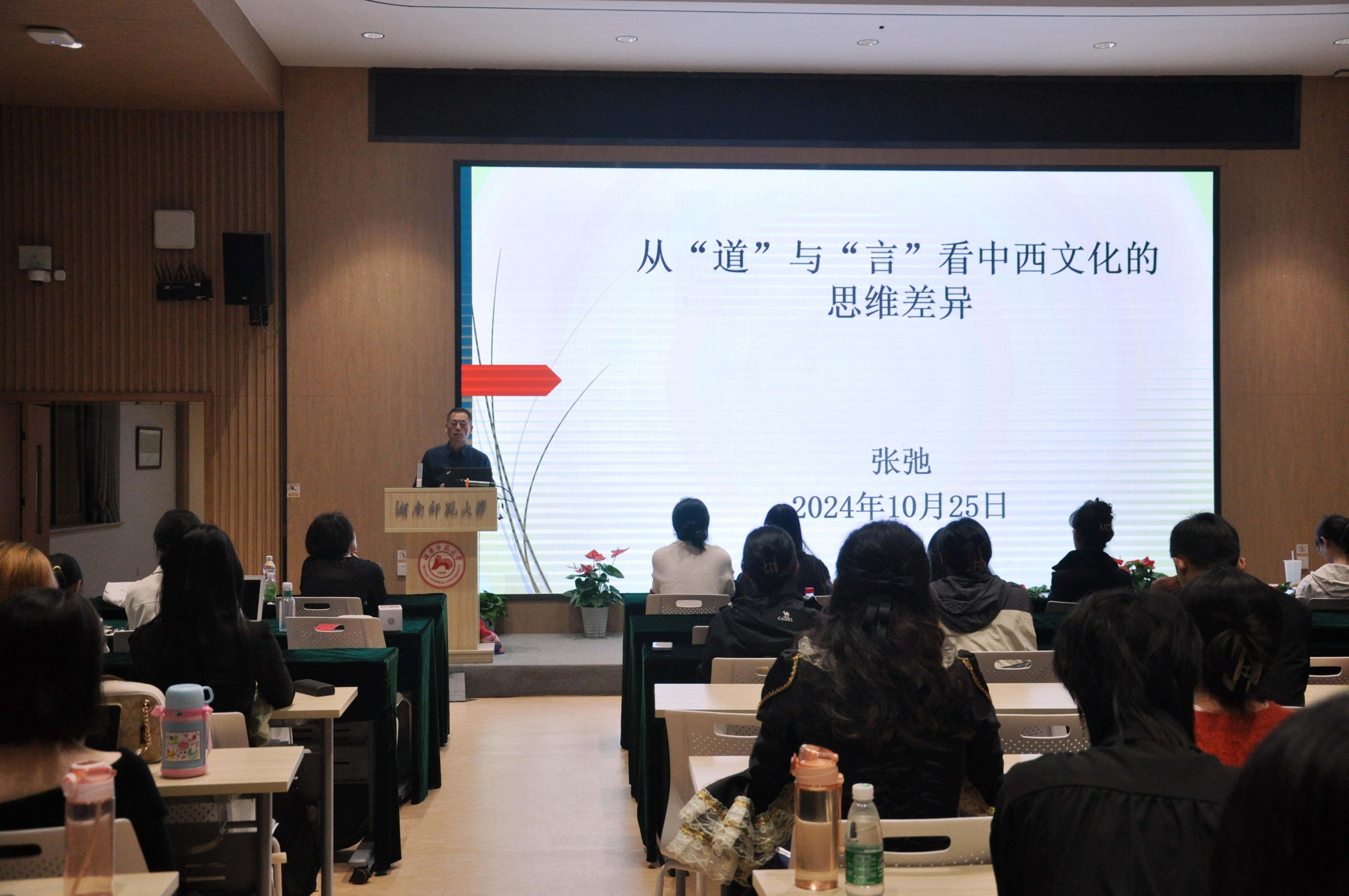 最后,张弛教授为师生讲授“开学第一课”。他以自己为本次活动所写的诗为引子,建议同学们无论是学习还是做事,要先求完成,再求完美,还要注意劳逸结合。他以《从“道”与“言”看中西文化的思维差异》为题,带领师生追溯西方的语言源头与发展脉络,探讨在“言”在西方不同语言中的呈现。张老师借助对中文“道”与“言”背后的文化内涵的深入探寻,论证了现代翻译家对“logos”(逻各斯)“错译”的原因与可行性,非“等同”而求不同文化间的“回应”。张老师从“道”,“道路”涵义中引出了中国人对实践的重视,帮助学生重新认识了中国自古以来深入民族血液中的类比思维;从西方重“言”,强调“辩”出发引出西方的严密的逻辑思维与理性。张老师结合东西方现代诸多社会现象进行讲解,使学生对该主题有了更深刻的理解。最后,张老师鼓励学生努力成为卓越的行动者与言说者,对未来充满信心,走向未来,创造未来。