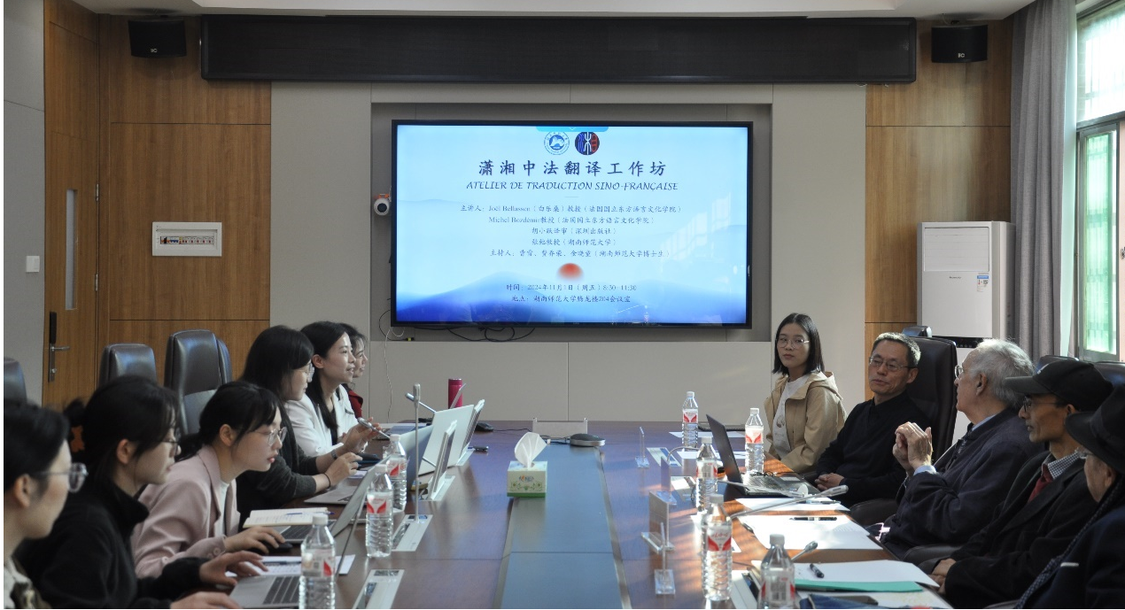 (通讯员 曹雪 李安然 刘盼)2024年11月1日上午,由太阳成集团tyc9728法语系主办的第二届“潇湘中法翻译工作坊”在腾龙楼204会议室隆重举行。本次活动特邀法国国立东方语言文化学院的Joël Bellassen(白乐桑)教授和Michel Bozdémir教授、深圳出版社胡小跃译审作为嘉宾,与太阳成集团法语系学科带头人张弛教授共同主讲。活动由费乔荣(2021级)、曹雪(2022级)和金晓童(2023级)等三位在读博士生联合主持。