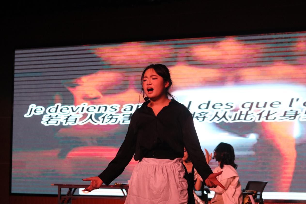 随后,演出在欢快的舞蹈Call me maybe(《给我电话哦》)中拉开帷幕,动感的节奏点燃了现场气氛。紧接着,法语歌曲Ça ira(《都会好》)以优美的旋律和深情的演唱赢得了阵阵掌声。压轴登场的是莫里哀的经典舞台剧Le malade imaginaire《无病呻吟》,将通俗易懂的17世纪法语与现代歌曲音乐相融合,生动再现了这部法国喜剧巨作的魅力,将现场氛围推向高潮。