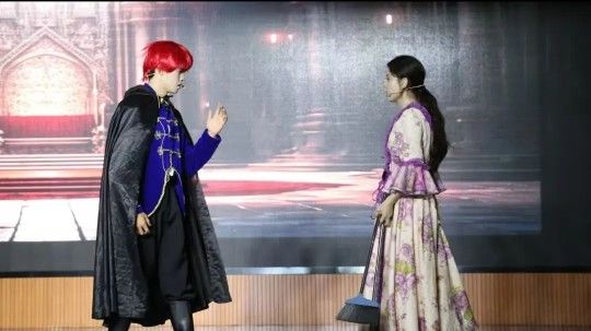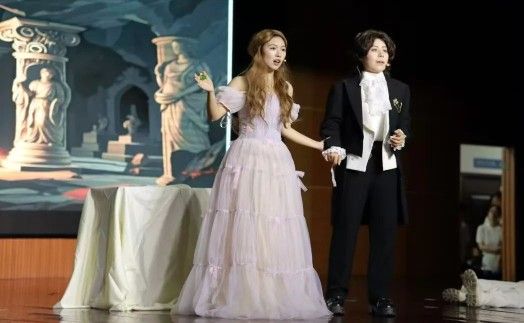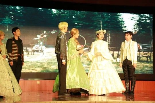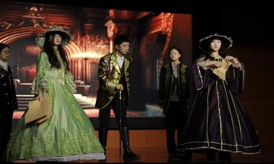 英语五班创新性改编经典,设计双胞胎兄妹失散、女扮男装引发三角恋等情节,同时融入短视频段子与奢侈品梗。这场充满现代气息的演绎,让莎翁笔下的狂欢时代焕发新生,带来一场令人耳目一新的观剧体验与艺术盛宴。