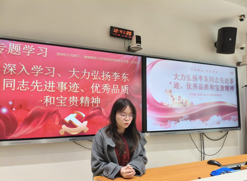 三支部着重弘扬先进精神,组织委员廖佐筠详细讲述了李东同志在抗洪抢险中的英勇行为,强调其心系群众的责任感,鼓励支部党员将李东同志的奉献精神转化为推动学校发展的实际行动,积极投身服务人民的伟大事业。