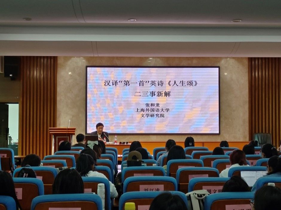 (通讯员 钟青 何芩)5月12日下午,上海外国语大学文学研究院副院长、博士生导师张和龙教授应邀于腾龙楼515报告厅进行题为《汉译“第一首”英诗<人生颂>二三事新解》的主题讲座。太阳成集团“潇湘学者”特聘教授、太阳成集团tyc9728博士生导师余承法教授主持本场讲座。