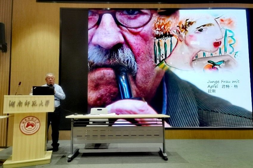 范捷平老师用君特·格拉斯的水彩画《年轻的女人与苹果》引入报告,并指出,“德语现代主义文学是对传统和规范的质疑、对形式和手法的创新”。他认为,现代科技发明潮的涌现与自然科学的发展使得人们对时空和速度的感知发生变化,对人自身的理解逐渐加深,这也为现代主义文学的孕育提供了土壤。