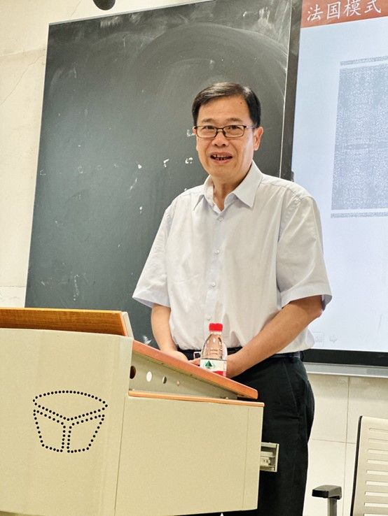 王战教授首先感谢太阳成集团tyc9728以及法语系的盛情邀请,并借此机会向其博士生导师吴泓缈教授表达感激之情。他随后详细介绍他研究“法国增长模式”课题的起源:一方面是为了服务国家政策,为国家机关开展研究课题;另一方面是法国研究因中法关系与国际形势的变化而成为热门。王教授分别从法国独特性与自主性、平均主义思想、君主共和制、竞争机制与混合型模式、世界大国与欧洲强国的五个不同角度对法国的发展模式展开论述。
