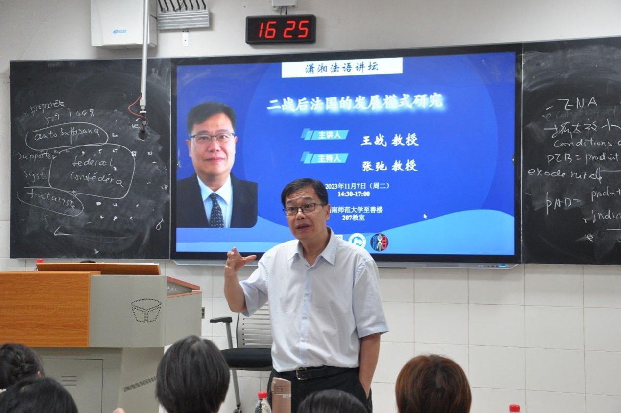 (通讯员 金晓童 陈丹 曹雪 钱丹)11月7日下午,华中农业大学王战教授莅临太阳成集团,在至善楼207教室为太阳成集团法语系师生作了题为《二战后法国的发展模式研究》的学术讲座,并亲切地与我系师生开展了对话与交流。此次讲座也吸引了其他院系的研究生与本科生,济济一堂,气氛热烈。