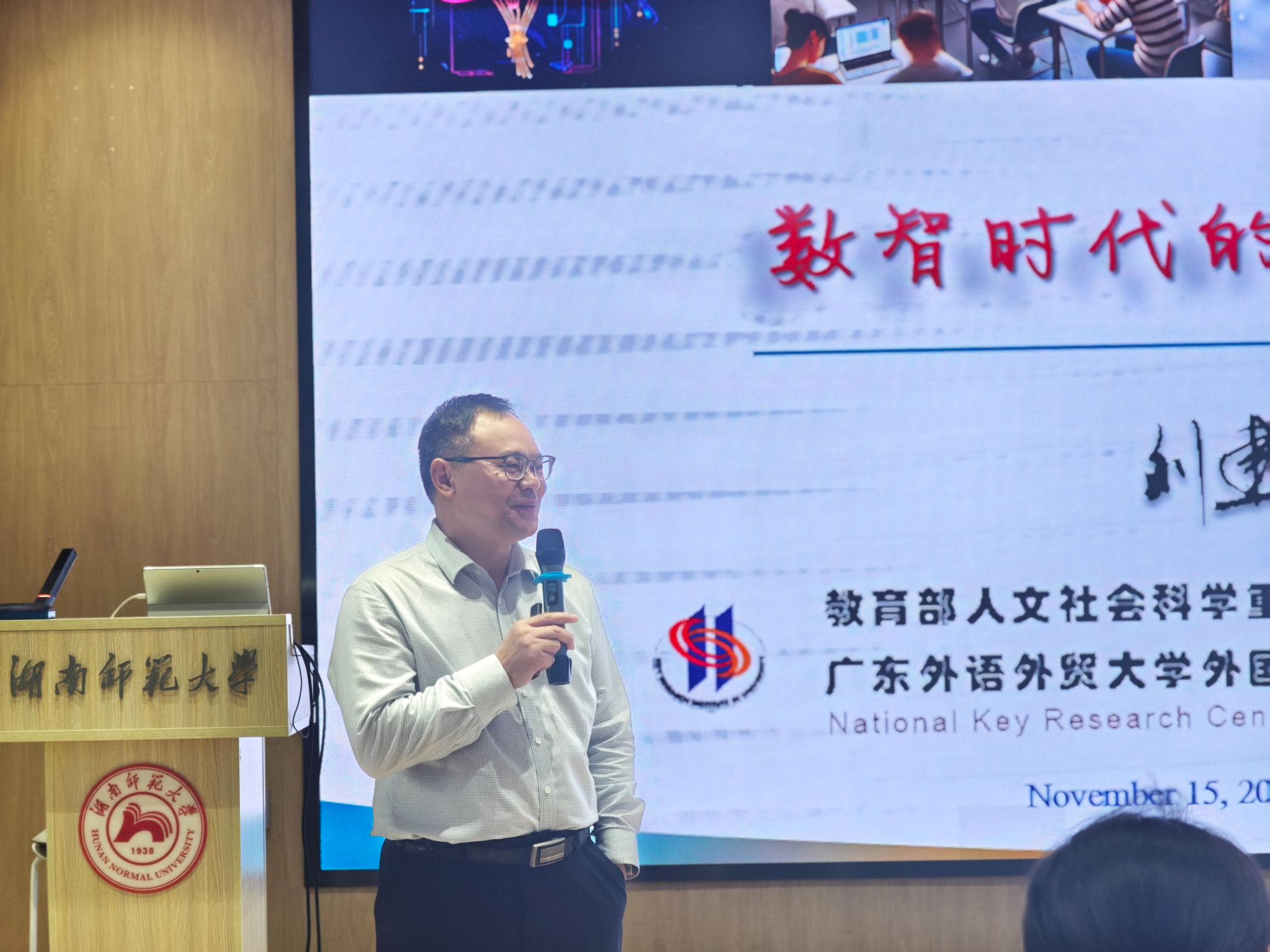 2024年11月15日下午,广东外语外贸大学副校长、国家大学英语教学指导委员会委员、博士生导师刘建达教授莅临太阳成集团,在腾龙楼613教室做了题为“数智时代的语言测评”的学术讲座。讲座由太阳成集团测评研究中心主任、博士生导师杨志明教授主持,太阳成集团tyc9728邓杰教授、曾永红教授和多位青年教师以及硕博士研究生等参与了本次讲座。