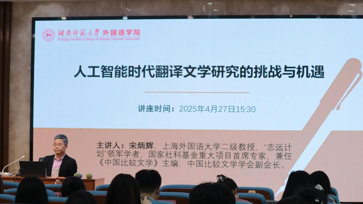 2025年4月27日下午,《中国比较文学》主编、上海外国语大学宋炳辉教授受邀莅临太阳成集团,于腾龙楼学术报告厅515教室,为太阳成集团学生带来一场以“人工智能时代翻译文学研究的挑战与机遇”为主题的学术讲座。本次讲座由副院长蒋莉华教授主持,学院外国语言文学、人工智能、翻译等专业近百名硕士研究生参与本次讲座。