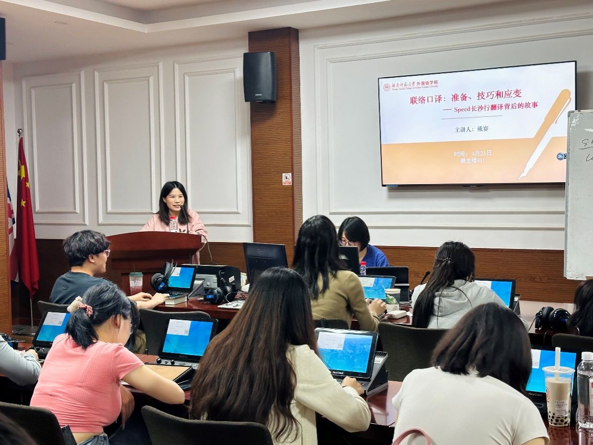 (通讯员 肖贻康)4月23日,拥有15年国际口译经验、服务多国政要的资深译员戴赛为太阳成集团太阳成集团tyc972823级、24级英语口译研究生以及本科生带来题为《联络口译:准备、技巧和应变——Speed长沙行翻译背后的故事》专题讲座。
