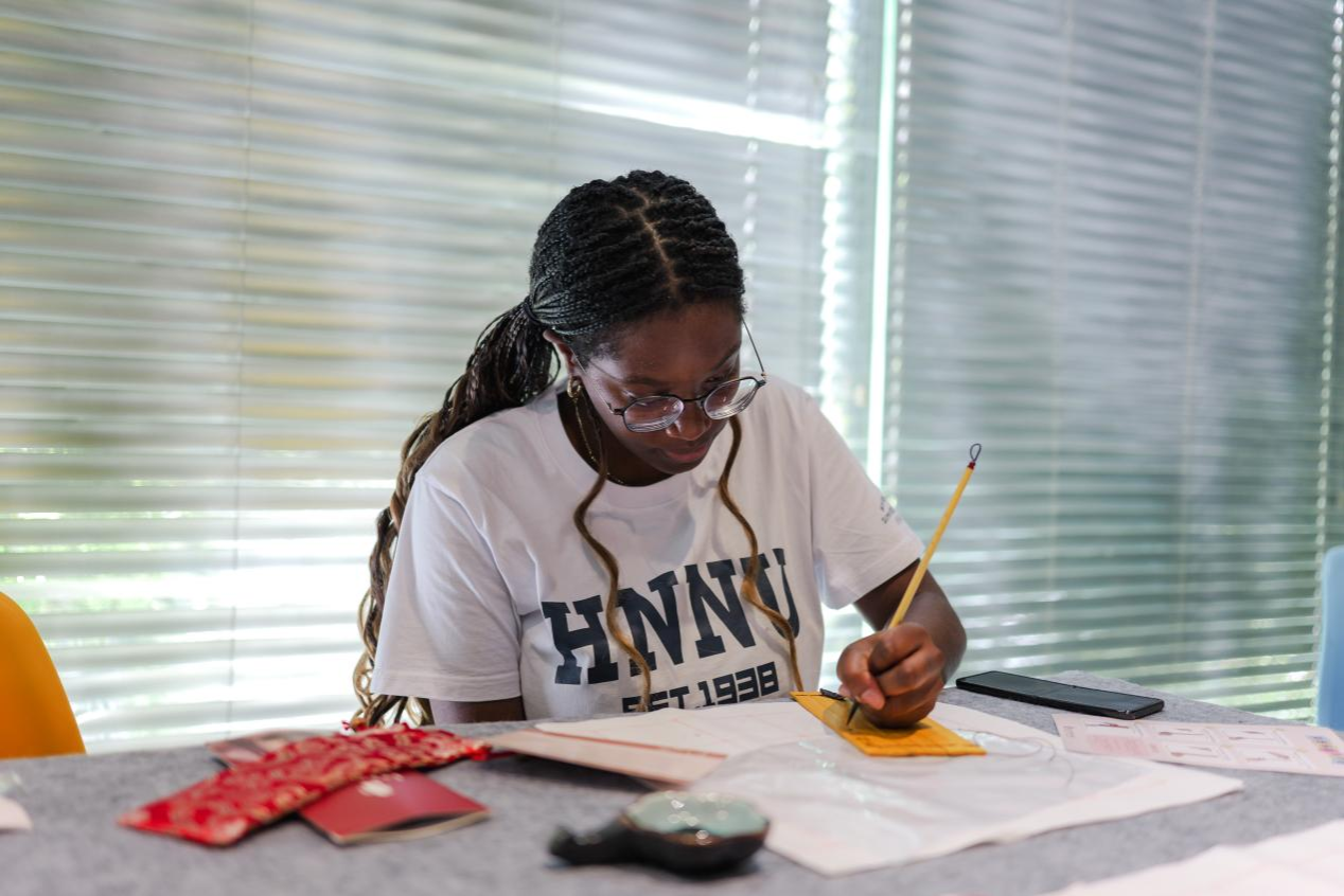 专题展厅参观结束后,中英师生们开启了简牍书写的沉浸式体验。他们亲手将竹片一一穿绳并编联成册,题之青睐的唐诗宋词,待墨汁晕染青简,卷之、捆扎并泥封,亲身体验中国古代简牍承载的厚重历史和深刻内涵。师生们纷纷表示一定将传统的简牍文化分享给身边的家人和朋友们,使他们了解简联制作的方法和技巧,让更多的人、更多的国家了解中国简牍承载中国文字和悠久历史的重大作用,从而全面、立体地了解中国和中国文化。