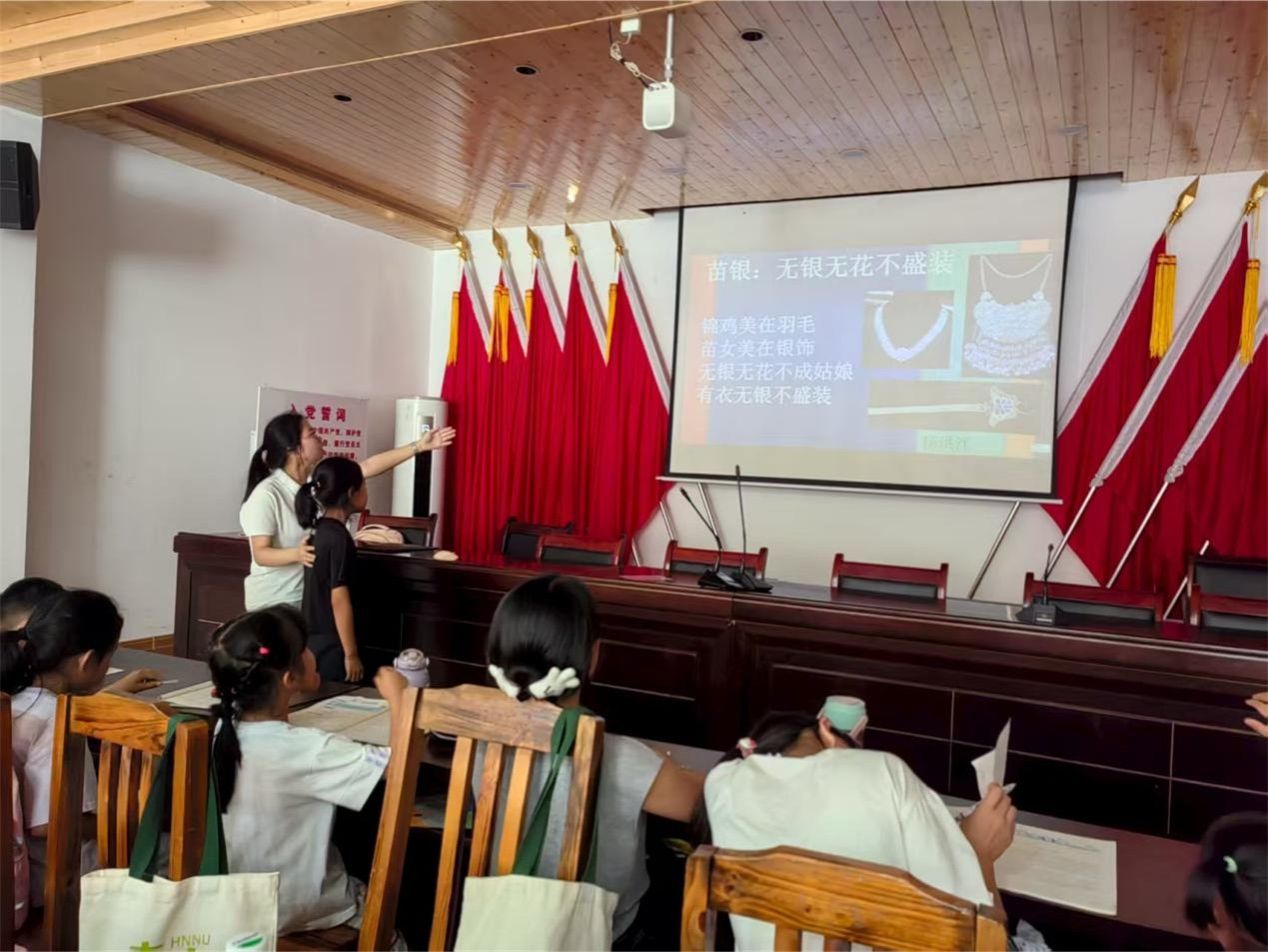 借母溪村地处沅水中上游,是五溪文化的重要发源地之一,侗族、苗族、瑶族与土家族在此世代聚居。课堂上,彭蓉蓉以杜甫诗句“五溪衣服共云山”为引,向同学们介绍了五溪地区民族服饰的历史渊源:“土家族服饰虽不如苗银、侗绣广为人知,但其‘西兰卡普’承载着深厚的文化密码。”彭蓉蓉以图文结合的形式,展示了土家族服饰中经典的“大烂枯梅纹”——由十二勾纹样组成的圆形图案,象征四季轮回与民族团圆,其繁复的几何构图与浓烈的色彩对比,尽显土家人对自然的敬畏与生命的热情。