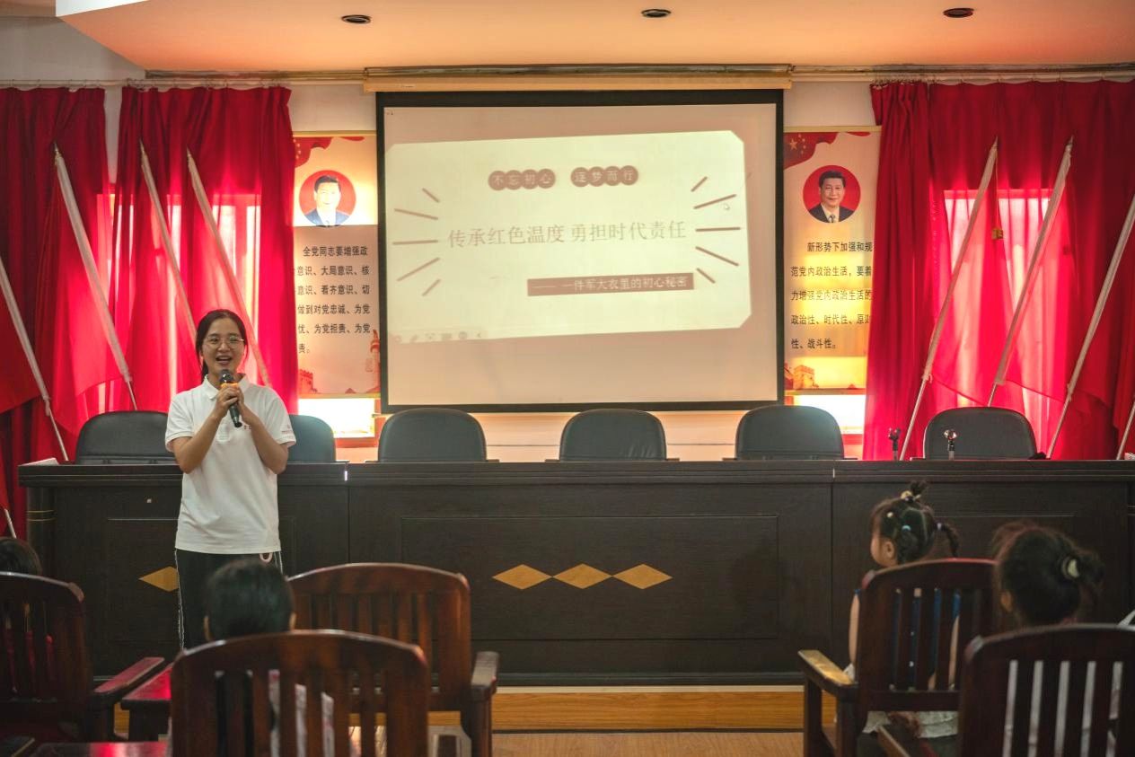 活动伊始,林鑫播放激昂的志愿主题歌曲,并以资兴本地红色故事为切入点,生动讲述了革命战争年代“一件军大衣”所承载的感人事迹,引导孩子们深刻体悟军民鱼水情与革命先辈的艰苦奋斗精神。随后,林鑫结合“为人民服务”的内涵、军民互助的典型事迹,以及团结协作的生动案例,向孩子们阐释了红色精神的要义,并引导他们思考如何在日常学习生活中传承红色精神。