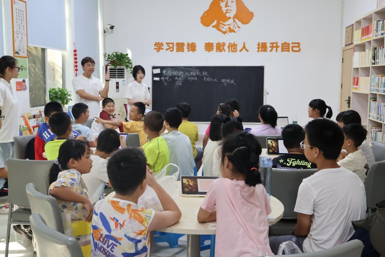 在进行中外动画角色形象比较时,实践团成员通过短片播放、性格分析与互动问答等方式,引导孩子们观察角色的外貌设计、成长经历以及所代表的文化价值。