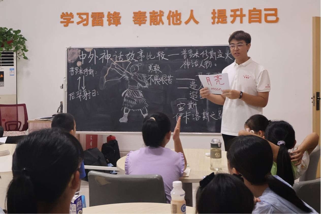 课上,实践团成员选取中国神话“后羿射日”与希腊神话“普罗米修斯盗取火种”两个具有太阳元素的神话故事。通过讲故事、图画演示与角色扮演,引导小朋友们分析文化符号差异,探讨神话故事中的价值观异同。