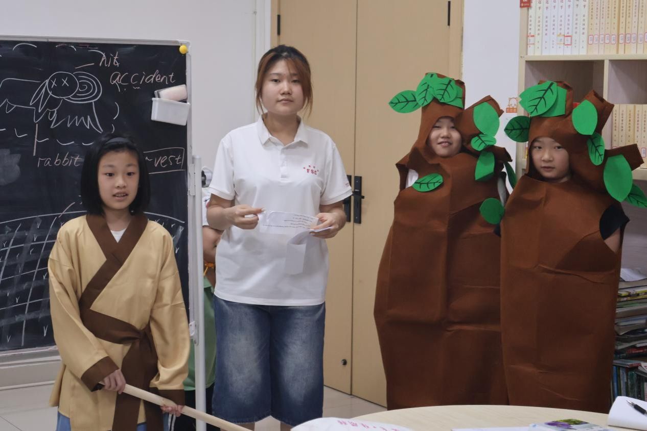 课堂开始,实践团成员通过轻松有趣的英语热身小游戏迅速调动小朋友们的注意力与参与热情。进入情景剧表演环节,实践团成员分角色朗读,配合道具演绎了寓言故事《守株待兔》的英文版,引导孩子们理解关键词汇和台词含义。随后,小朋友们被分成若干小组,在实践团成员的带领下进行排练,自由发挥进行再创作。在展示环节,小朋友们用英文表达重新诠释了故事,有的组还加入了自己的创意结尾,引发现场一阵阵掌声与笑声。整个课堂过程紧凑而富有趣味,既强调了语言实践,又锻炼了团队合作与表达能力。