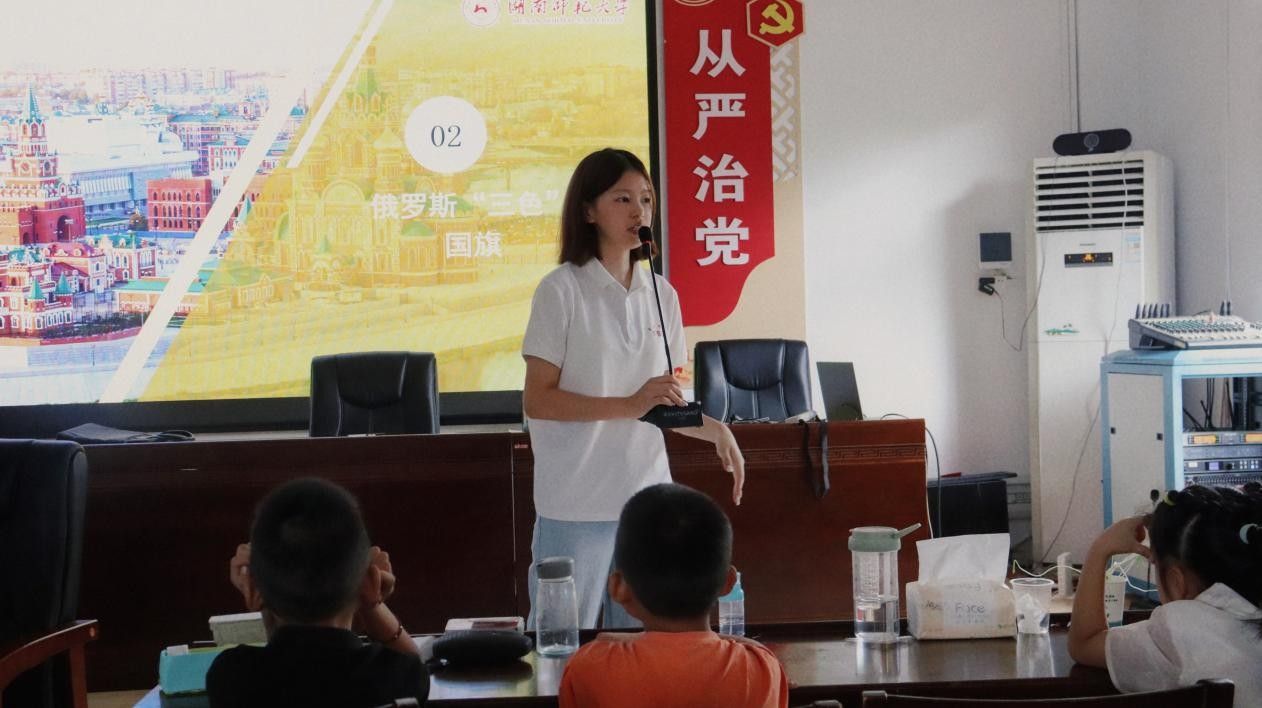 (通讯员 马纳克 周宣彤 陈星宇)7月22日上午,太阳成集团“‘凤’起苗乡‘语’见四方”暑期社会实践团(下文简称“实践团”)在张家界市慈利县阳凤坪村村委服务中心开展“走进俄罗斯”俄罗斯文化扩展课程。实践团成员郭蓉作为主讲人,其他实践团成员以及当地四十余名报名儿童参加。