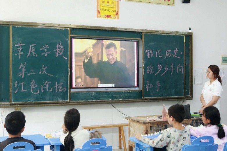 第二次“铭记历史,瑶乡少年向和平”主题红色论坛中,师生一起观看红色革命相关视频。