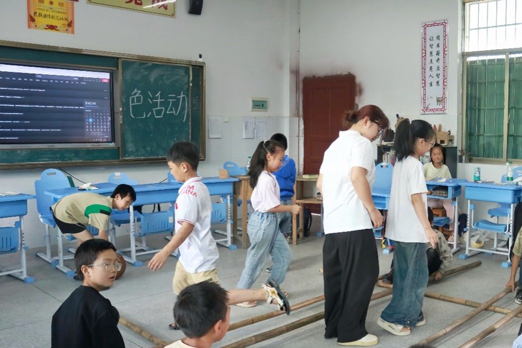 活动初始,学生们和实践团成员集体表演了花瑶民族特色节目:“竹竿舞”。10余根青竹按“井”字形排列,欢快的舞步和节拍体现了花瑶乡独特的民族风情。将“竹竿舞”纳入此次活动开篇环节,让实践团成员在亲身体验中感受花瑶文化的魅力,增进对当地民族习俗的了解。
