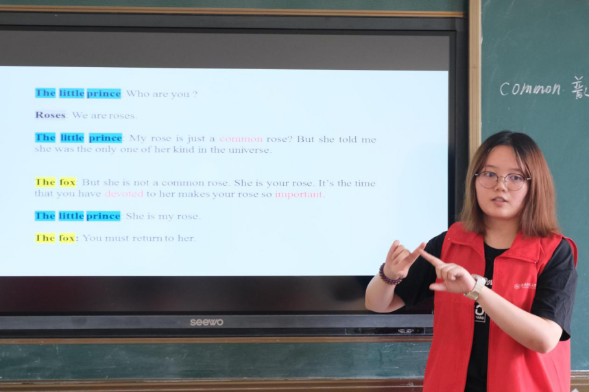 分享会开始前,刘洋诺让学生们进行分组活动,每个游戏互动环节实行累积加分的制度,以此调动学生参与活动的积极性和主动性。“大家心中的王子是什么样的?”---刘洋诺以该问题为引,由浅入深地讲解《小王子》这本书中的故事情节,并从这些故事情节中提炼出《小王子》中所蕴含的主题思想。分享会上学生们在刘洋诺的指导下通过分组游戏以及角色扮演进行展示。